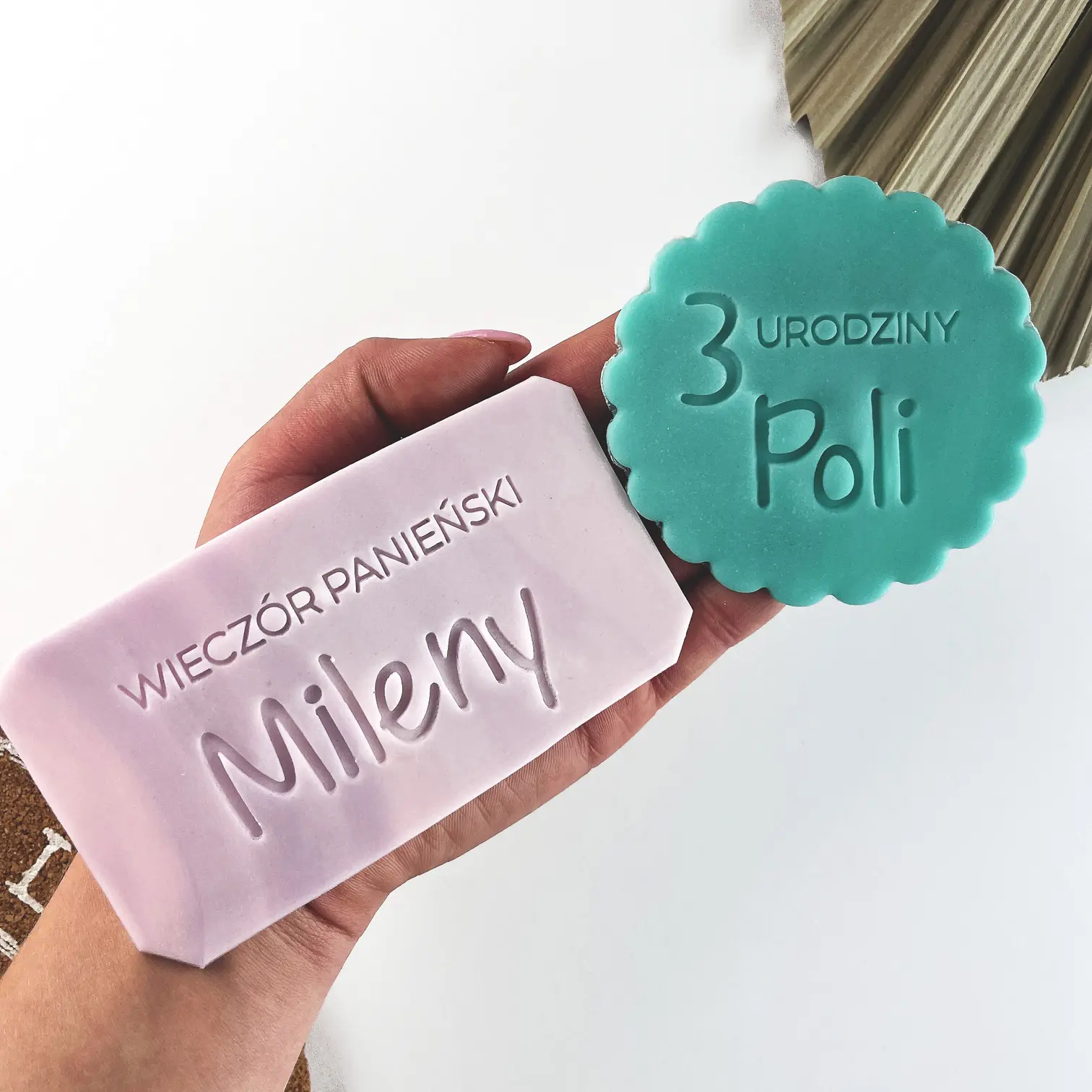 Stemple z gotowymi napisami: URODZINY, WIECZÓR PANIEŃSKI, CHRZEST ŚWIĘTY, PIERWSZA KOMUNIA ŚWIĘTA, BABY SHOWER i ROCZEK będą idealną alternatywą dla długich napisów, które trudno rozmieścić na masie, a także dodadzą dekorowi różnorodności.