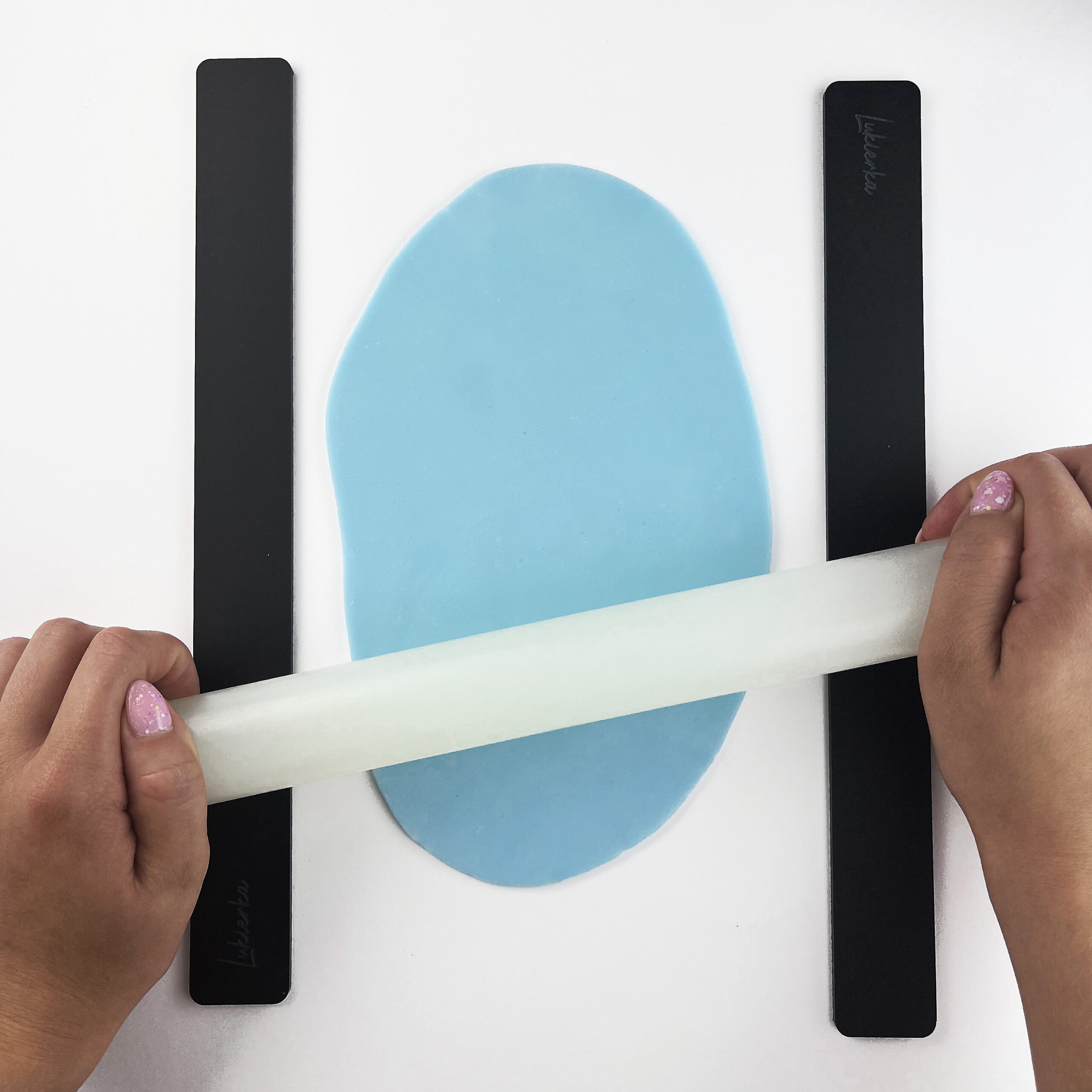 Zestaw listw dystansowych z panelem do odciskania pozwoli równo rozwałkować masę, a następnie odcisnąć napis bez obaw, że wciśniemy go za głęboko lub za płytko.