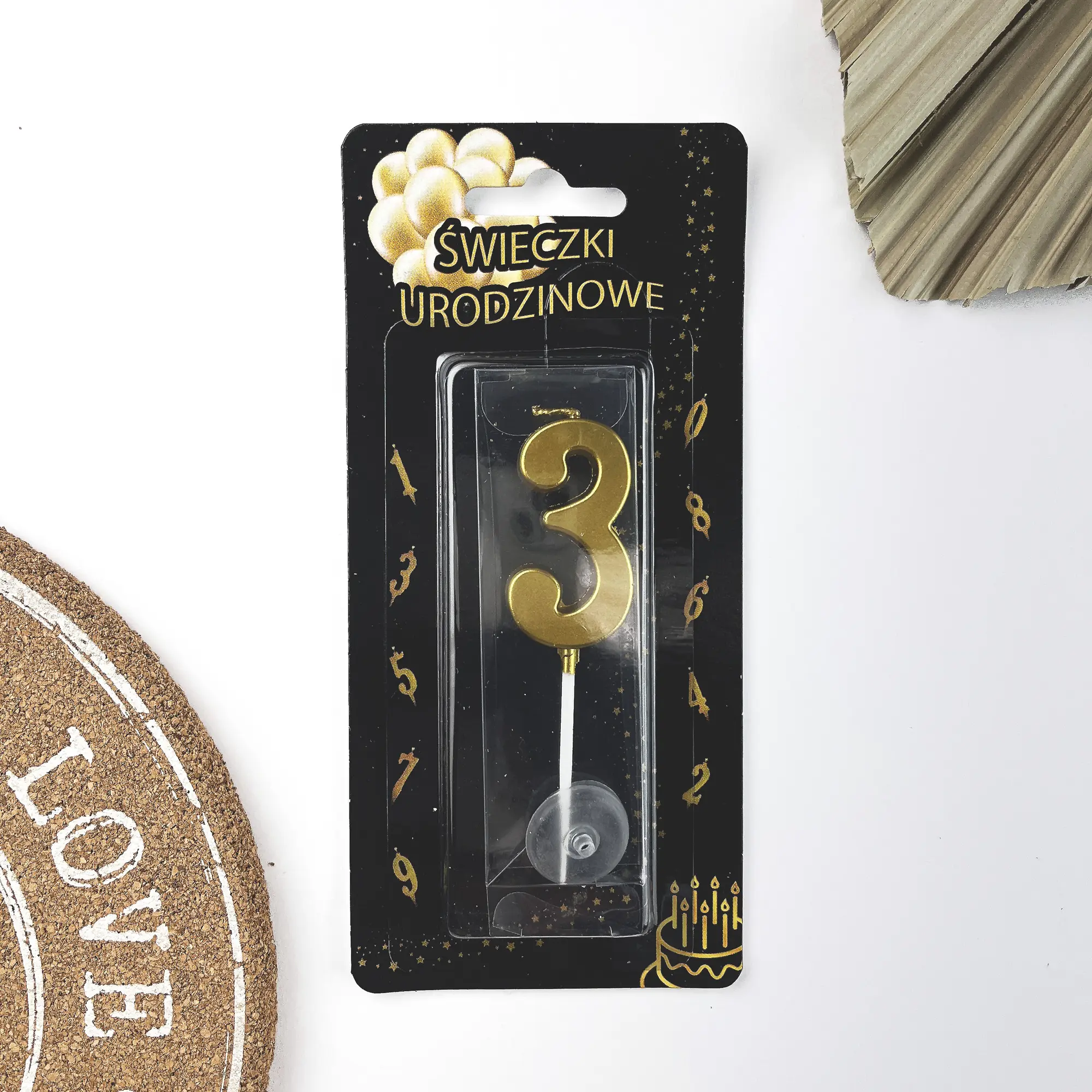 Świeczki urodzinowe będą idealnym wykończeniem tortu i spełnią każde wypowiedziane życzenie solenizanta. Świeczka złota z cyfrą 3 doda słodkościom indywidualnego charakteru. Świetnie sprawdzi się na trzecie urodziny lub trzecią rocznicę np. ślubu.