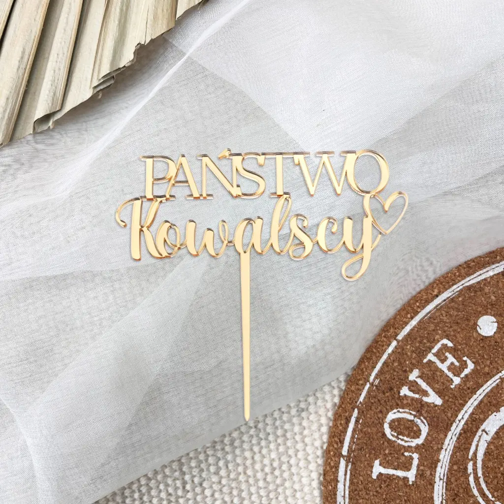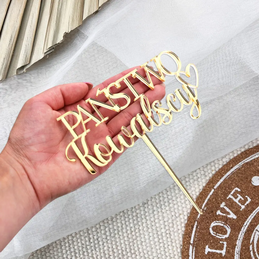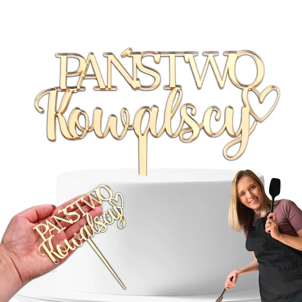 Ślub to najważniejszy dzień w życiu każdej pary! Wspaniałe fotografie, olśniewające stroje – to wspomnienia, które zostaną na zawsze! Idealnym dopełnieniem tej wyjątkowej okazji będzie elegancki tort! Dodany topper ślubny “Państwo + nazwisko” uświetni wygląd tortu i jeszcze bardziej podkreśli charakter uroczystości, czyniąc ją niezapomnianą i magiczną!