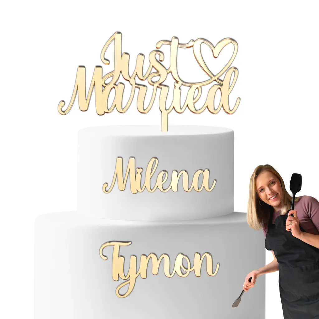 Ślub to najważniejszy dzień w życiu każdej pary! Wspaniałe fotografie, olśniewające stroje – to wspomnienia, które zostaną na zawsze! Idealnym dopełnieniem tej wyjątkowej okazji będzie elegancki tort! Dodany personalizowany ZESTAW topper ślubny “Just Married” z imionami uświetni wygląd tortu i jeszcze bardziej podkreśli charakter uroczystości, czyniąc ją niezapomnianą i magiczną!